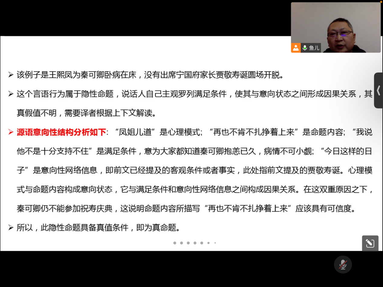 2023年1月4日晚,外国语学院刘彬教授应邀为william第十八届博力学术论坛 “翻译生态与生态翻译”专题论坛做了题为“意向性视域下翻译动态性研究”的讲座。我院部分教师及全体研究生参加了本次讲座。