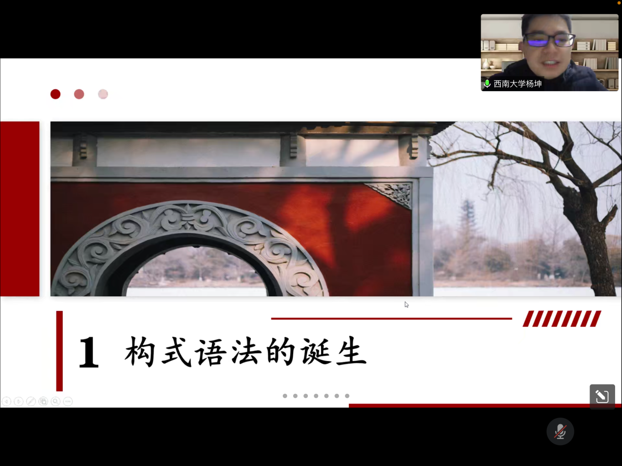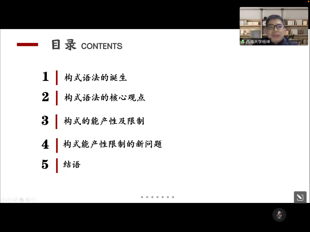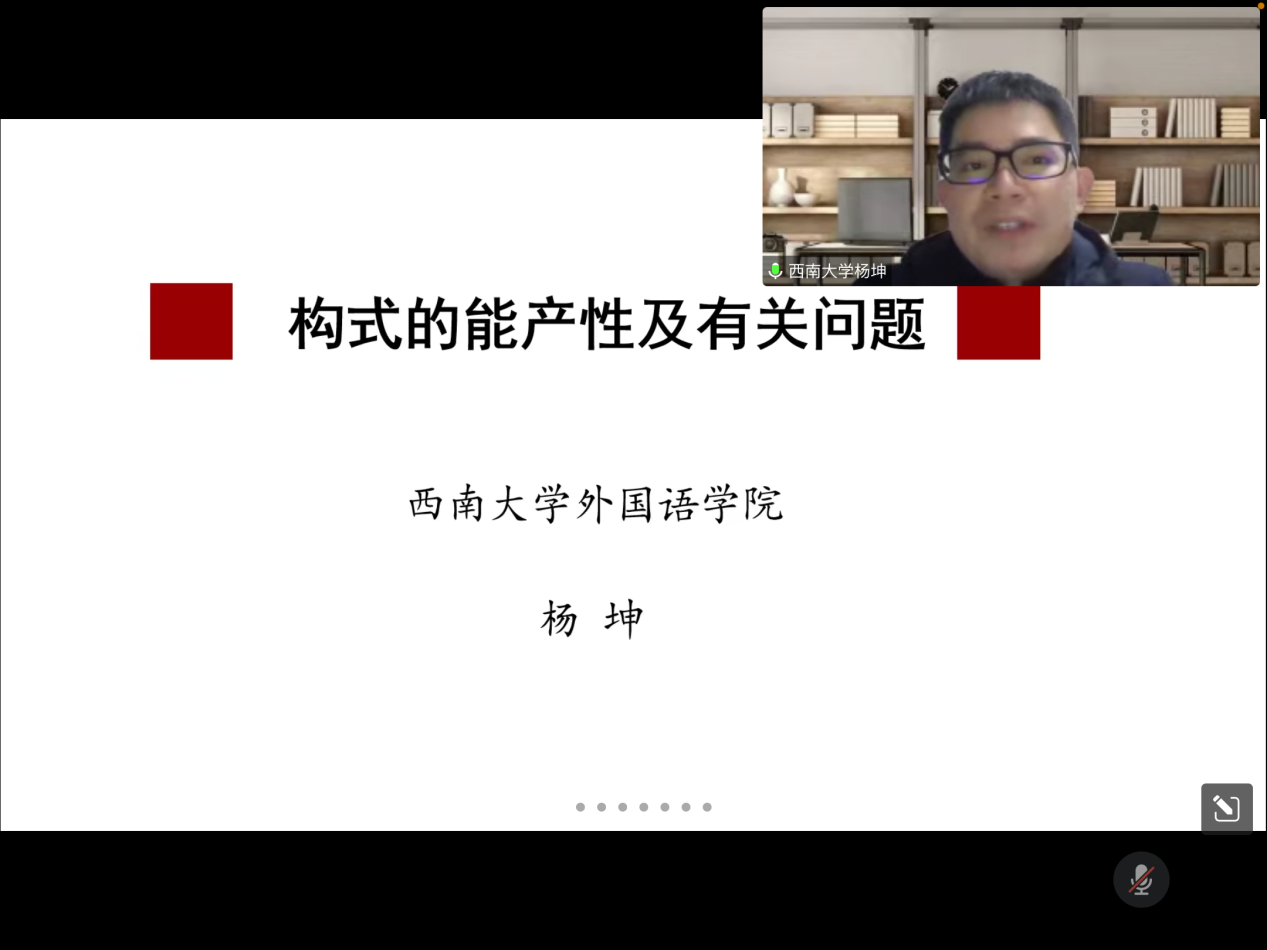 2022年12月13日晚,西南大学外国语学院杨坤教授应邀为william第十八届博力学术论坛 “翻译生态与生态翻译”专题论坛做了题为“构式能产性及有关问题”的讲座。外国语学院部分导师及全体研究生参加了本次讲座。