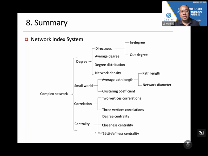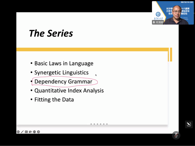 讲座中,何教授就语言基本定律、协同语言学、依存语法、定量指标分析和拟合数据做出详细阐释。首场讲座中,他向同学们介绍计量语言学中的三大定律,即分布定律、函数定律、演化定律,以实例带领大家推演定律公式并进行实际运用。在第二场讲座中,何教授详细阐释了协同语言学的思想。第三场讲座中,何教授探讨了依存句法树、价值理论、依存关系、依存距离等概念。第四场讲座中,何教授对定量指标分析进行深入探讨,他表示计量语言学研究需要大量数据,分析定量特征需要计算文本的相关定量指标。最后一场讲座中,何教授重点讲解了依存语法及其构成要素,通过思维导图的形式,让同学们对其有一个初步的认知。