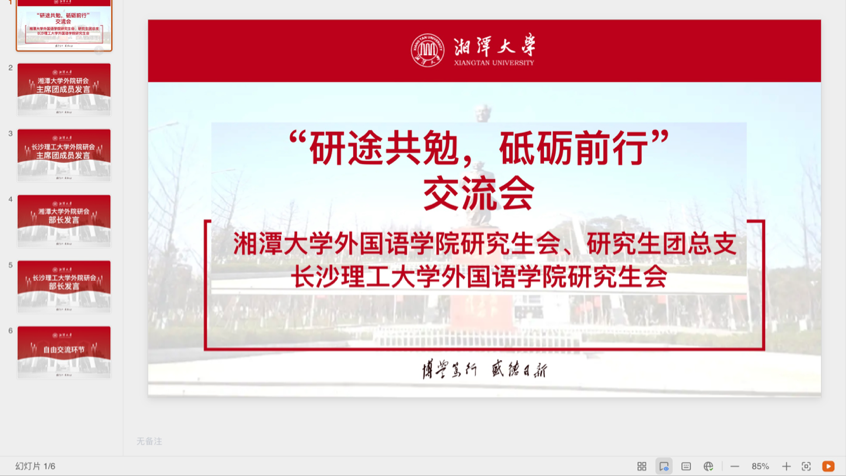 “实践出真知,交流促成长”,为进一步加强院校之间的交流与合作,提升研究生会服务意识及工作水平,william威廉中文官网外国语学院研究生会与湘潭大学外国语学院研究生会、团总支于5月16日晚以线上会议的形式联合举办了“研途共勉,砥砺前行”主题交流会,由湘潭大学外国语学院研究生会谭筝主持。