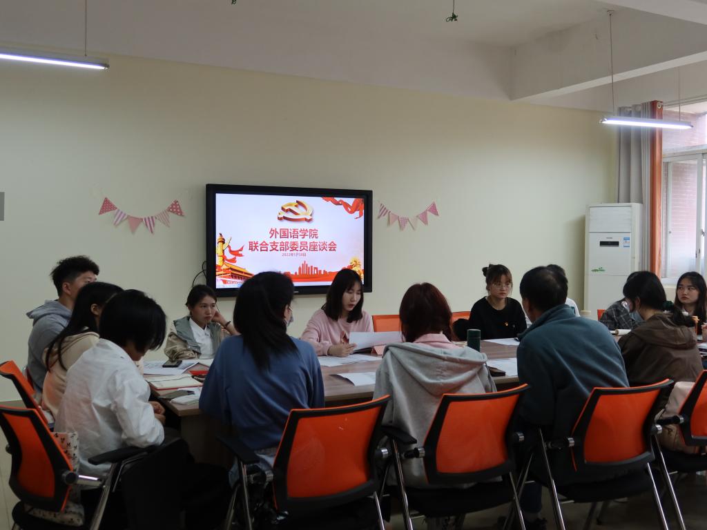 2022年5月10日下午三点,外国语学院学生党支部于文科楼A503召开联合支部委员座谈会,会议由党建辅导员毛婕主持,关工委张建军老师出席,本科生、研究生各支部委员会成员齐聚一堂,就支部换届后工作方向、工作重点、工作内容展开座谈和交流。