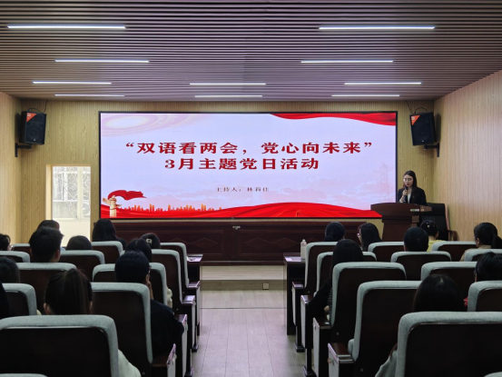 活动伊始,研究生党员刘若松以中英双语带领全体师生系统学习两会精神,带领大家观看两会专题视频,解读《政府工作报告》的重点内容,深入分析了“新质生产力”“科教兴国战略”“零基预算改革”等十大年度任务目标。同时,结合“具身智能”“耐心资本”等热门双语词汇进行互动竞猜,通过趣味问答的方式加深党员对两会精神的理解。在这一环节,全体党员积极参与,主动发言,现场气氛十分活跃,讨论声和掌声此起彼伏。