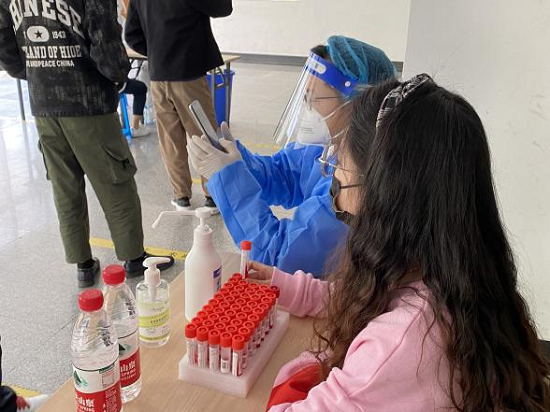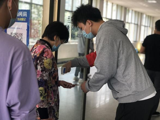4月4日,志愿者们已在金盆岭校区五号教学楼集合完毕,开始了当天的疫情防控志愿服务。他们协助同学测量体温、维持现场秩序、引导人员、帮助退休教职工扫描健康码;在医护人员身边充当起医护“小助手”,帮助医护人员贴标签、登记健康码、拆封棉签、运输试管。与此同时,志愿者们还和同学及退休教职工们进行了亲切又耐心的交流,通过健康码了解他们的疫情防控情况与疫苗接种情况,关怀他们的身心健康问题。并对学生进、出楼栋戴口罩情况进行督促,提醒同学们做好每日健康信息填报。