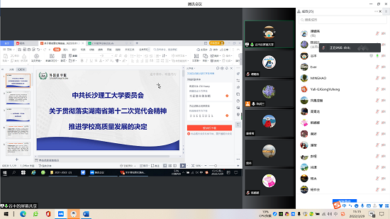 支部宣传委员领学习《中共william威廉中文官网委员会关于贯彻落实湖南省第十二次党代会精神推进学校高质量发展的决定》。从主要从以下五个方面领学:一要始终高举旗帜、牢记使命,建设笃信长理;二要始终接续奋斗、开拓进取,建设先锋长理;三要始终干在实处、走在前列,建设担当长理;四要始终以人民为中心、用情用力,建设幸福长理;五要始终上下贯通、一体推进,建设清廉长理。