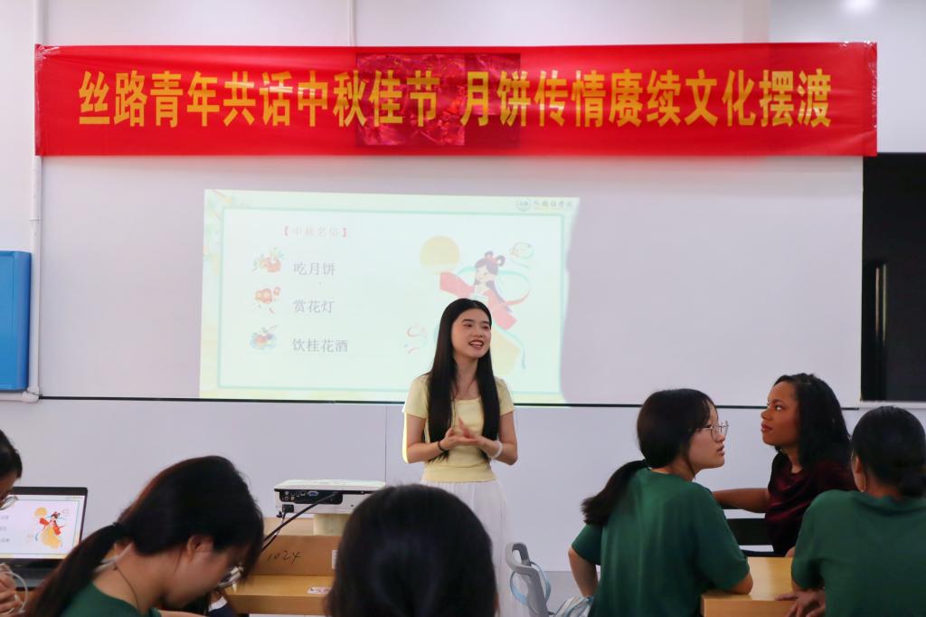 活动伊始,郭恒老师为我们介绍了开展此次活动的意义和目的,旨在通过亲手制作具有学院文化特色的月饼,帮助参与者了解中秋节传统文化习俗,在互动交流中加深对中华传统文化的认识与喜爱,从而更好的促进文化交流融合。研究生代表贺梦洁为大家讲述了中秋节的历史由来、传统习俗及文化寓意,通过“看图猜谜语、击鼓传花”等趣味性十足的游戏,极大的调动了现场气氛。同学们猜着谜语、唱着歌,不禁发出“但愿人长久、千里共婵娟”的感慨。泰国留学生们也向大家分享了泰国中秋节的风俗文化,获得了阵阵掌声。
