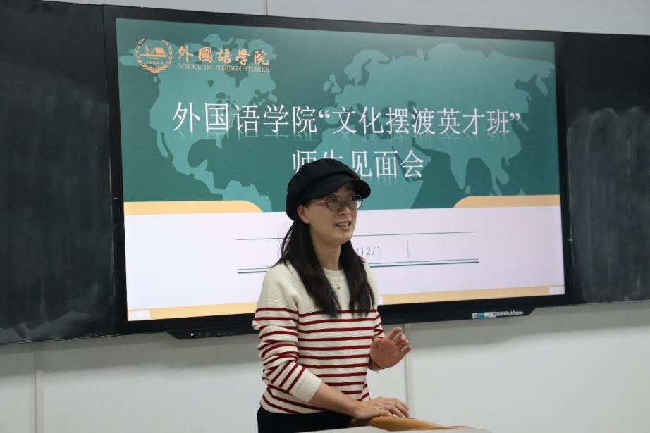 在互动交流环节,“文化摆渡英才班”班长范宇喆表示,期待与同学、老师们进行思想上的碰撞,将学院“学参中外,语汇天下”的理念深耕大家心中,承担起一名“文化摆渡者”的责任与使命。