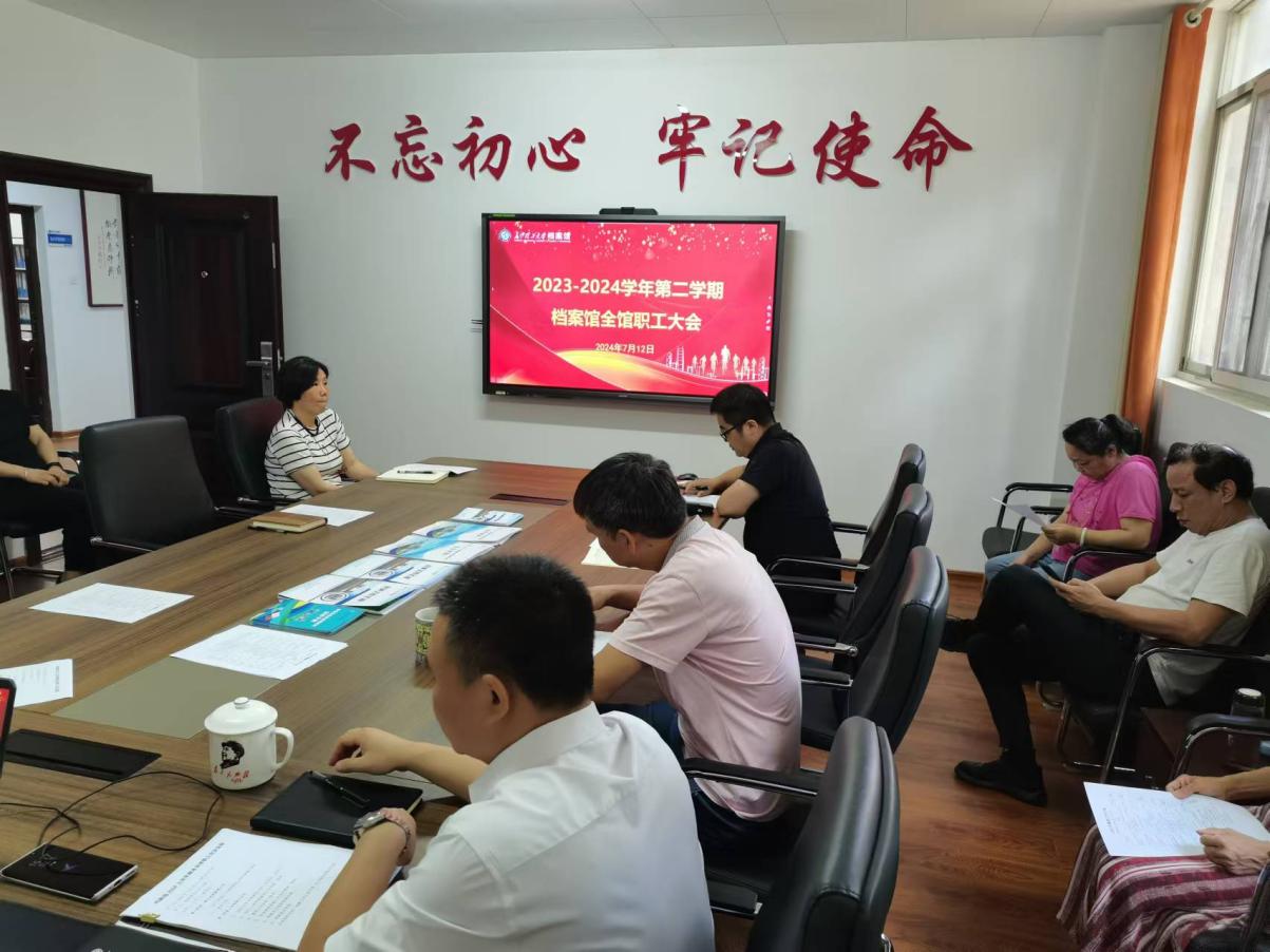 7月12日,档案馆2023-2024学年第二学期期末总结会议在110会议室召开,会议由王任飞副馆长主持,全馆职工参加会议。