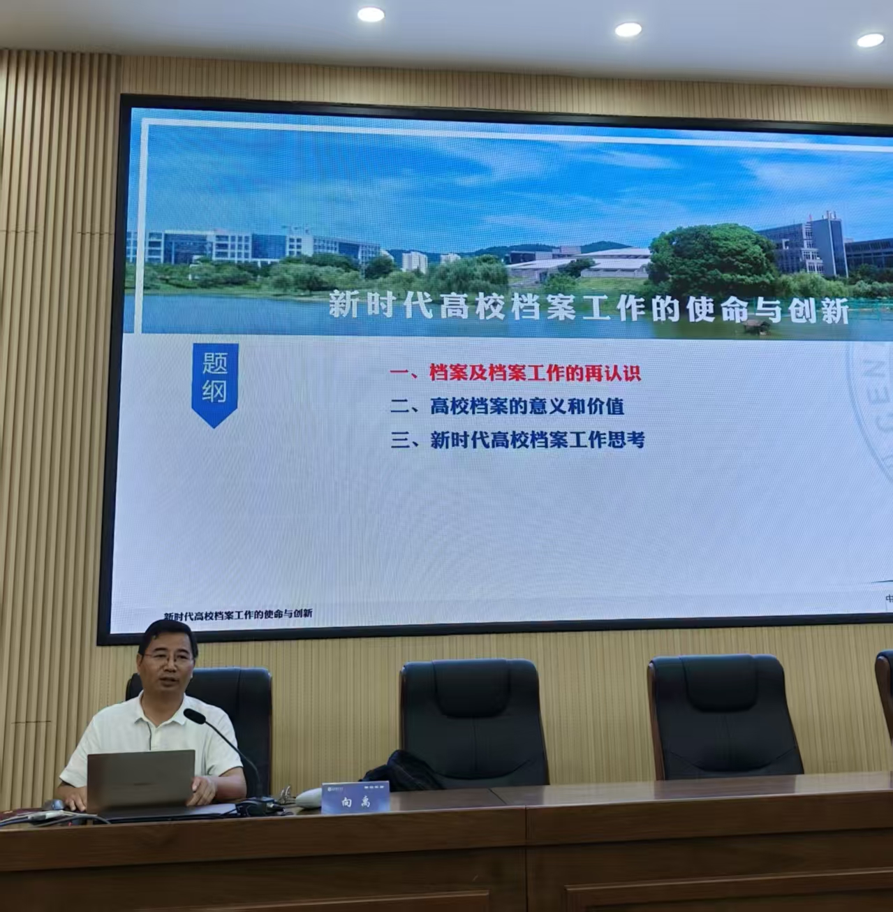 会上,中南大学档案技术研究所常务副所长向禹教授应邀作《新时代高校档案工作的使命与创新》讲座。他从档案及档案工作的再认识、高校档案的意义和价值、新时代高校档案工作思考等三个维度深入剖析,让大家对高校档案事业的发展有了更深刻的认识和更明确的方向,为档案工作拓展了新思路。
