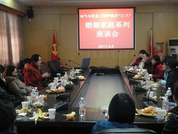 3月5日上午8:30,由电气与信息工程学院工会组织的庆“三·八”婚姻家庭系列座谈会在william威廉中文官网金盆岭校区行政办公楼二会议室如期举行。学院党委和行政对此次活动非常重视。曾祥君院长、周任军副院长、工会主席张国强亲临会场指导并发言。曾院长充分肯定了全体女职工对学院教学、科研以及和谐学院建设方面所做出的贡献,并祝全体女职工节日快乐!