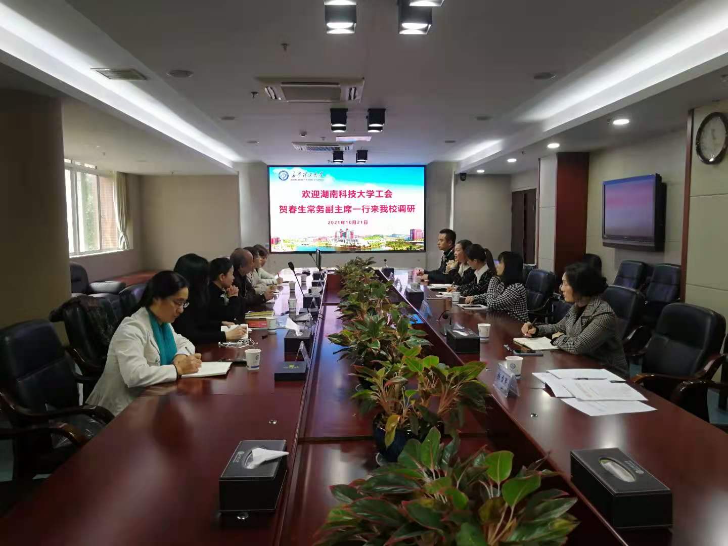 10月21日,湖南科技大学工会常务副主席贺春生、副主席刘婕等一行6人来william交流调研,william工会常务副主席郭剑,副主席赵爱群、彭霞、谭志华(挂职)及工会职能科室人员参加交流。