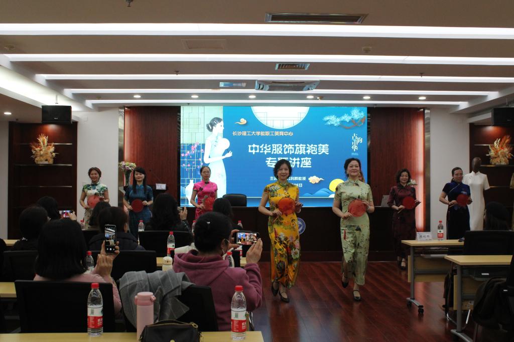活动中,教职工旗袍协会的八位老师带来了精彩的旗袍秀表演,在婉约悠扬的乐曲声中,她们身着旗袍迈着优雅的步伐展示了中国传统旗袍服饰之美与独特的中国女性风采,将现场的气氛推向高潮。