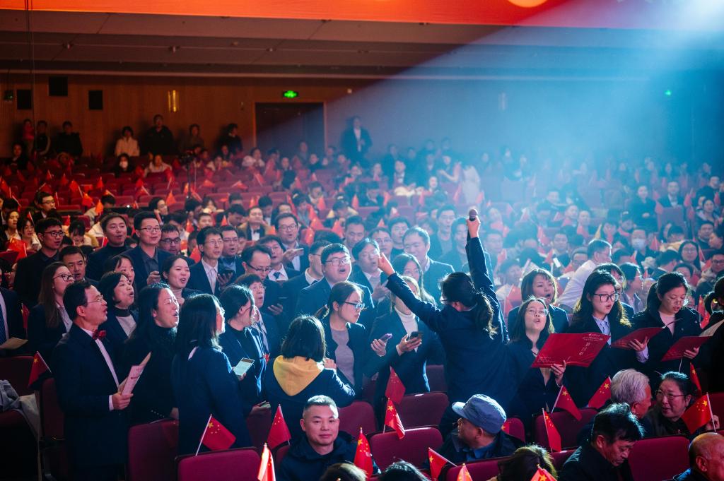 现场拉歌环节现场,七个方阵在观众席中放声歌唱,激情洋溢,整个现场气氛热烈,红旗飘扬,嘹亮的歌声久久回荡在云塘大会堂上空。