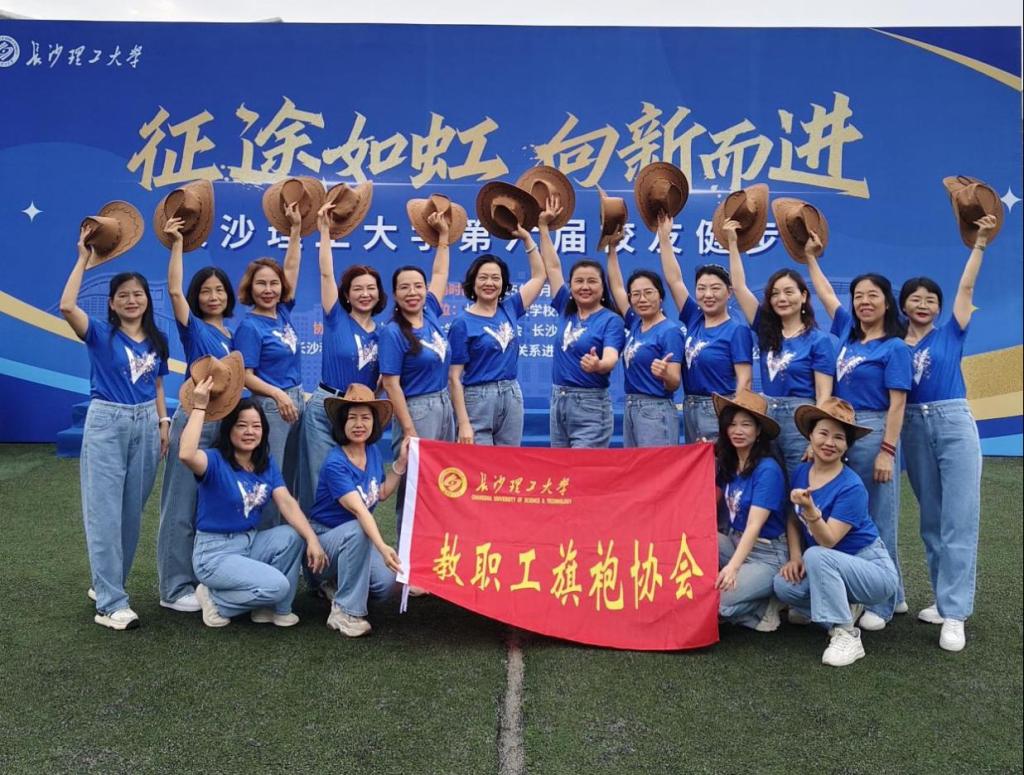 接着,随着发令声响起,师生们从体育场出发开始健步行,旗袍协会成员们也跟随一起参与活动。蓝色文化衫组成的行进长龙与初夏校园相映成辉,构成一幅生机盎然的画卷。大家合影留念定格笑脸,记录下在校园美景中的足迹。