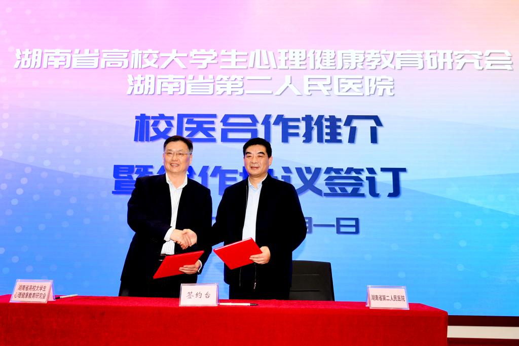 会上,湖南省第二人民医院发展服务部主任谌艾佳在会上介绍了校医合作内容和方式。湖南省高校大学生心理健康教育研究会和湖南省第二人民医院签订了校医合作框架协议。在未来3年里,湖南省第二人民医院将支持湖南省高校与各地精神专科医院建立绿色通道,建立大学生心理危机干预快速转介、诊治机制;省第二人民医院将组织医生定期到学校开展诊疗活动和会诊,并为高校心理健康教育专职教师队伍提供相关专业能力培训。