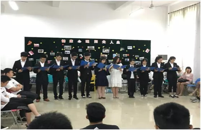 11位班委进行了诗朗诵,简单的话语却包含着不简单的含义。这是他们成为这个班级一分子之后的第一张身份牌,是他们的承诺,是他们的期待,是他们对17电卓最真挚的爱!