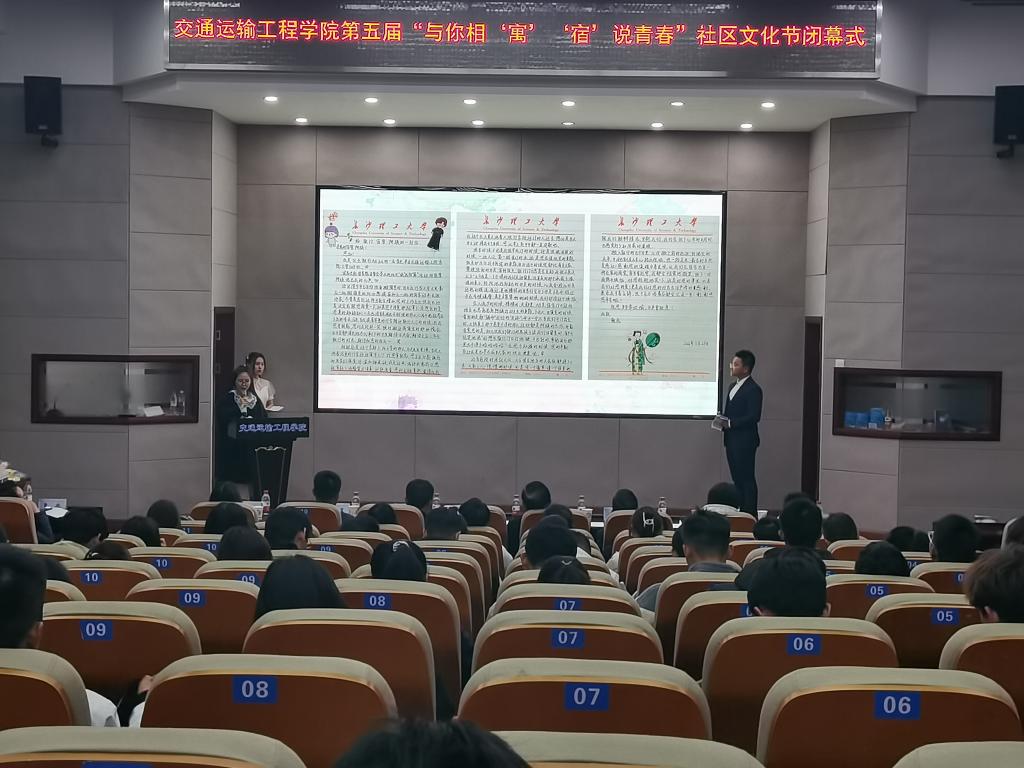 一封封纸短情长的书信,一段段精心制作的视频话剧,一张张搞笑幽默的表情包......近期,交通学院的同学们在社区文化节活动中“宿”说青春,分享着宿舍生活的点点滴滴,再现一个又一个奇思妙想。为进一步推动学生社区精神文明建设,深化寝室文化生活内涵,营造健康、活泼、文明、安全、幸福的社区氛围,交通学院于12月9日晚在云塘校区工科二号楼交通科技报告厅举办第五届“与你相‘寓’ ‘宿’说青春”社区文化节闭幕式活动。校关工委常务副主任王乃厚、学工部副部长王煜坤、交通学院党委副书记涂道勇、党建特邀组织员吴滨及学工办全体辅导员出席活动,交通学院第十五届团委学生会主要成员、参赛选手、各班生活委员等近两百人参加活动。