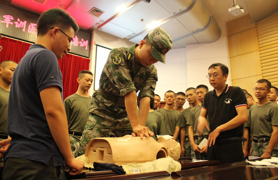培训中,邱双发博士首先对心肺复苏术和气道异物梗阻的急救进行了理论讲解,然后运用人体模型,由刘继强博士现场配合,对心肺复苏的基本方法边演示边进行讲授,并指导william带训教官分组进行实际操作演练,让带训教官对现场急救有了深入直观的学习,使其对基本急救的方法和技能有了更深的掌握,同时还指导学生对海姆立克急救法进行了演练。贺志飚博士和刘继强博士分别就热射病的早期识别和急救处理以及隐匿性代谢综合征并发症的急诊处理,用生动的语言,多媒体的授课形式,给william师生作了细致的讲授。
