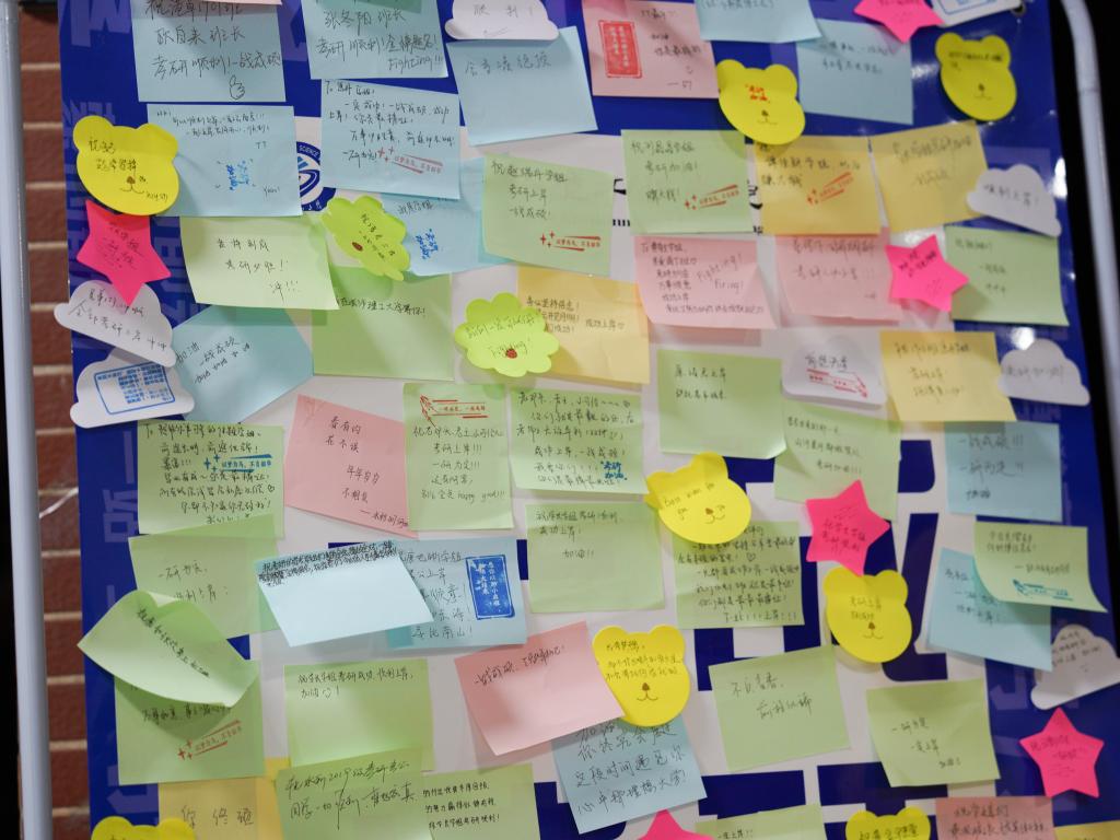 “下一站,上岸”,是考研学子对自己的祝福。宿舍楼内的留言板上,考研学子的愿望语以及学弟学妹们手写的祝福语布满了留言墙。“学长学姐,拼尽全力向前冲,你们一定能够金榜题名!”“说好了,我们一‘研’为定”……“KO焦虑,我们OK的!”电台音频和“追梦赤子心”考研助力MV为每位考研学子舒缓了备考压力,激发了考前动力,助力研考最后一公里。此外,学院老师为每位考研学子送上装有寓意着“时旺运旺”的旺旺雪饼、“成功上岸”的冰糖橙、“考研顺利,金榜题名”定制百事可乐、“解忧排疑”解压玩具、“温暖予你”暖宝宝、定制口罩和心愿祝福卡的“金榜题名”大礼包,一件件富有寓意的物件,从礼包袋的设计、物资的采购,再到装袋、发放,整个过程都寄托了学院对考研学子们的深情祝福。