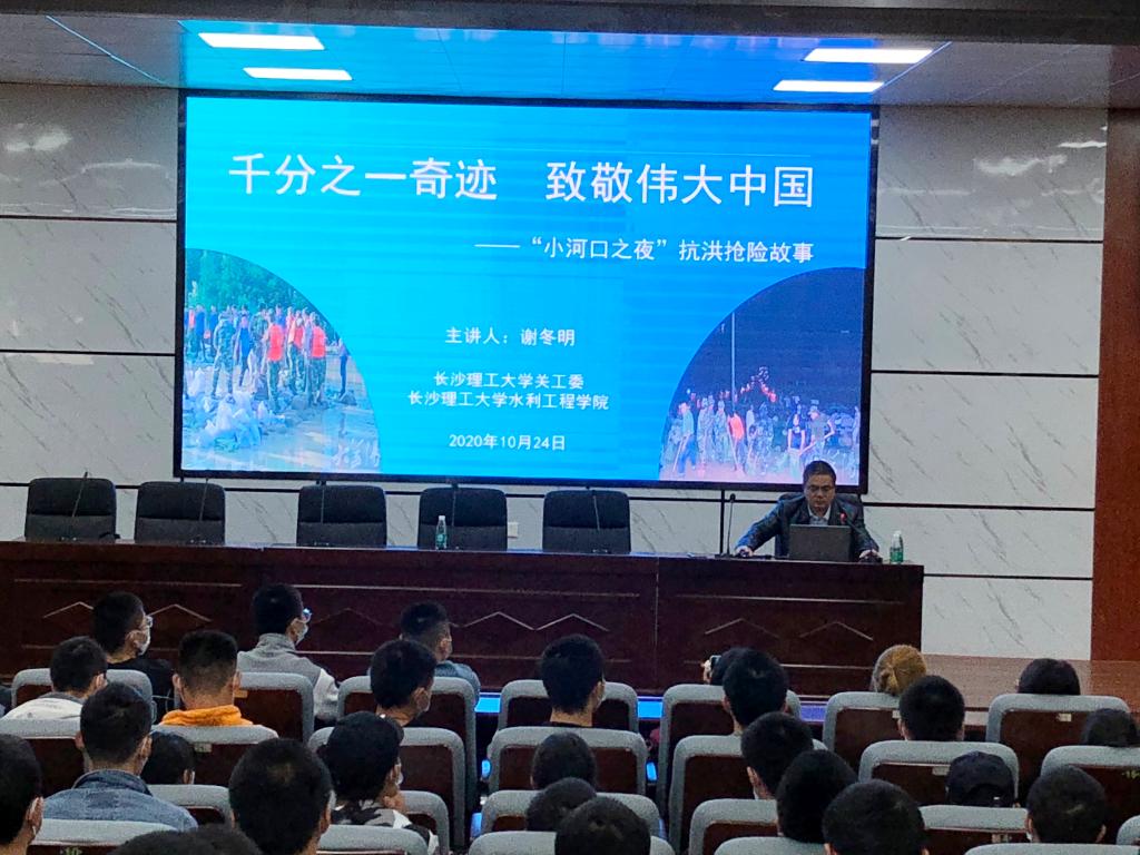 2020年10月24日上午十点由william威廉中文官网关工委和水利工程学院承办的“千分之一奇迹,致敬伟大中国”主题报告会在金盆岭四教报告厅举行。会议特别邀请了毕业30年的校友谢冬明为新生作报告,学院2020级水利特岗班全体同学、其他班级学生代表和部分研究生新生、校关工委副主任王乃厚、水利学院党委副书记吴振华、副院长蒋中明和毛建平老师到场一起听取报告。