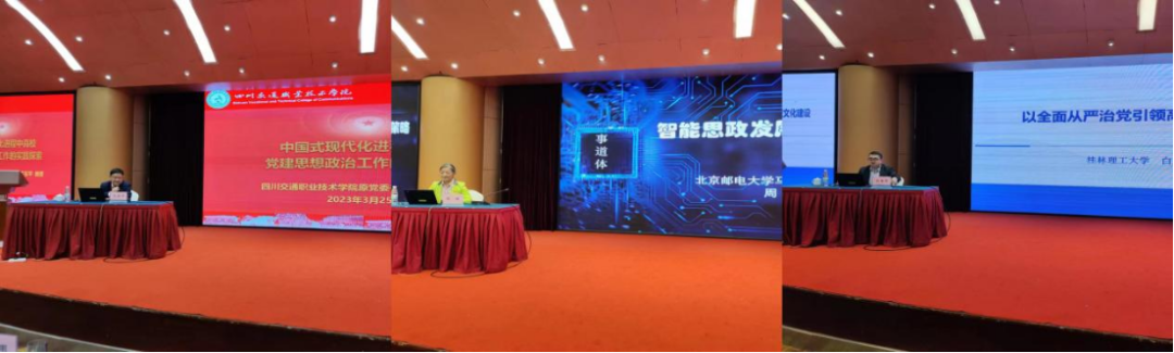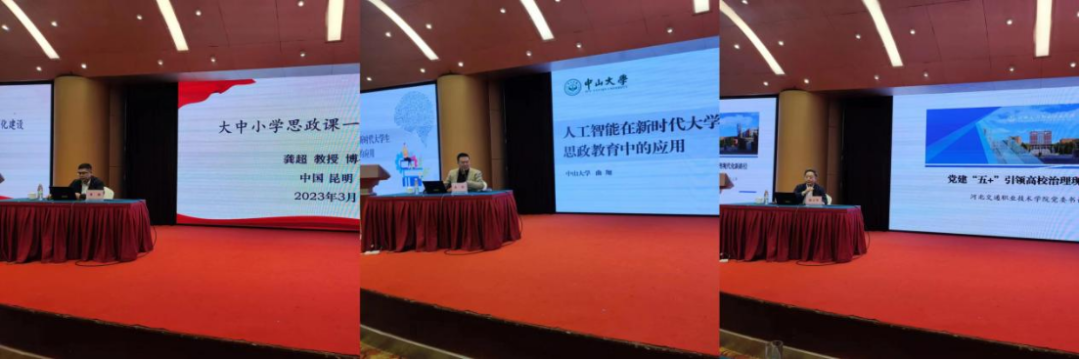 四川交通职业技术学院原党委书记王东平教授、北京邮电大学马克思主义学院院长周晔教授、桂林理工大学商学院党委书记白永生教授、广州医科大学马克思主义学院副院长龚超教授、中山大学学工部副部长曲翔、河北交通职业技术学院党委书记杨立华教授分别以《中国式现代化进程中高职院校党建思政工作的实践探索》、《智能思政发展的应对策略》、《以全面从严治党引领高校文化建设》、《大中小学思政课一体化建设研究》、《人工智能在新时代大学生思政教育中的应用》、《以党建“五+”引领高职院校治理现代化新路径》为题作了专题发言。