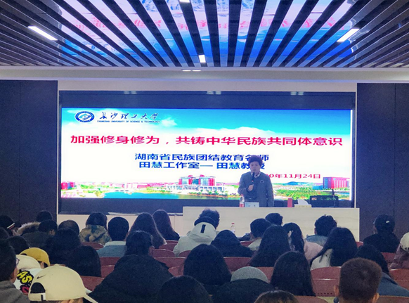 为贯彻学习党的十九届五中全会精神,11月24日下午,学工部邀请湖南省民族团结教育名师、湖南省大学生道德素质提升工程精品项目--田慧工作室--首席专家田慧教授为william200余名民族学生举行了题为“加强修身修为,共铸中华民族共同体意识”的讲座。william民族学生教育管理专职辅导员地里努尔、木拉迪以及新疆内派教师热米拉老师参加。