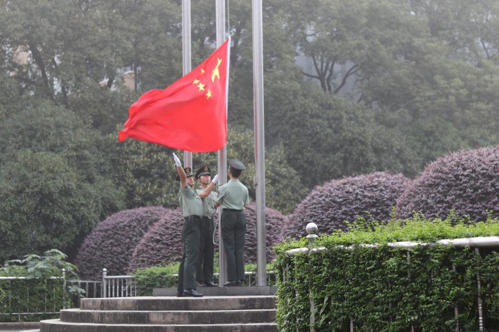 6点55分,升国旗仪式正式开始,随着指挥员下达出旗口令,国旗班护旗方队迎着朝霞,迈着坚实雄健、整齐划一的步伐,护送国旗走向升旗台。伴随着雄壮的国歌声,鲜艳的五星红旗冉冉升起,迎风飘扬。全体师生面向国旗行注目礼,齐声高唱国歌,向伟大的祖国致以节日的祝福和崇高的敬意。