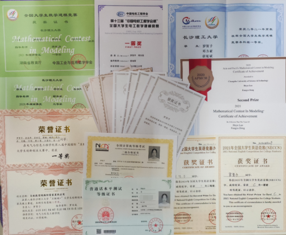 获得2021年“高教社杯”全国大学生数学建模竞赛国家级一等奖、第十三届“中国电机工程学会杯”全国大学生电工数学建模竞赛国家级一等奖、2021年全国大学生英语竞赛(NECCS)C类国家级一等奖、2020年和2022年全国大学生英语(NECCS)C类国家级二等奖、2020年亚太地区数学建模大赛国家级二等奖、2022年“互联网+”创新创业大赛产业命题赛道省级二等奖(2项)。