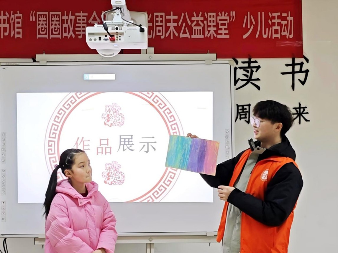 2026年3月,第三十八期阳光周末公益课堂在天心区图书馆温情开讲。恰逢雷锋月,我院志愿者以“春天的祝福——我的第一幅桃符”为主题,将非遗文化与雷锋精神巧妙融合,带领小朋友们走进桃符的前世今生,在剪贴绘画中传递温暖祝福,播撒文化传承的种子。
