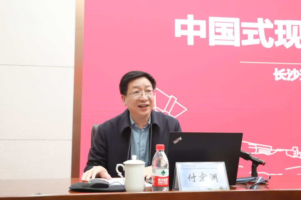 本次课程在激昂的团歌中拉开帷幕。付宏渊以“中国式现代化与青年使命”为主题,用哲学的思辨和历史的广度,将中国式现代化的历史逻辑、理论逻辑和实践逻辑娓娓道来,从中国式现代化与中国青年、大学及大学使命、青年学生的“诗和远方”三个方面展开授课。他指出,要带着对马克思主义的信仰准确理解中国式现代化,中国式现代化是实现中华民族伟大复兴的根本之路,中国青年是探索中国式现代化历史进程中的先锋力量。此后以“什么是中国式现代化”为出发点,围绕党的历史发展脉络,强调只有中国共产党才能“救中国、发展中国、领导实现中国式现代化”。中国青年应明确历史定位,坚定理想信念,坚定不移听党话、跟党走,努力成长为堪当民族复兴重任的时代新人。