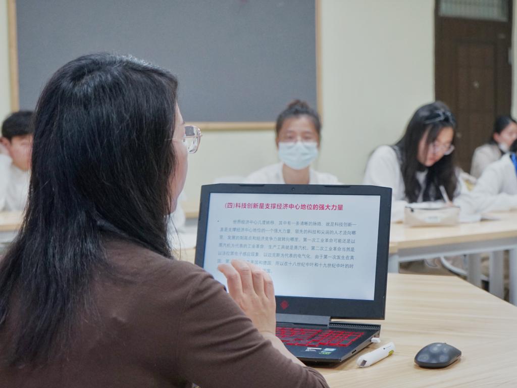李雨燕以“加快科技创新,握好大国重器”为题,围绕党的十九届五中全会公报中“把科技自立自强作为国家发展的战略支撑”这一重要命题,向同学们讲解科技强国、科技创新等重大战略部署的由来和意义,深入阐释科技对生活方式和人们思维产生的影响,从科学技术应用实施的价值导向、科技产生的社会效应等多个方面,阐释中国特色社会主义制度的优势和强大生命力。她提出,科技创新应该牢牢把握面向世界科技前沿、面向经济主战场、面向国家大需求、面向人民生命健康的价值取向,结合美国对华制裁、哈工大MATLAB被禁用等“卡脖子”事件,强调要把大国重器牢牢把握在自己手里。
