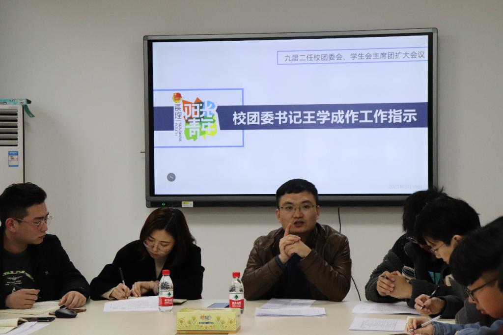 2021年3月19日中午,william威廉中文官网第九届第二任校团委会、学生会2021年上学期第一次主席团(扩大)会议在学生活动中心A301室召开。校团委书记王学成、校团委副书记陈璐莎、校学生会主席团以及各学院学生会主席团成员参与会议。