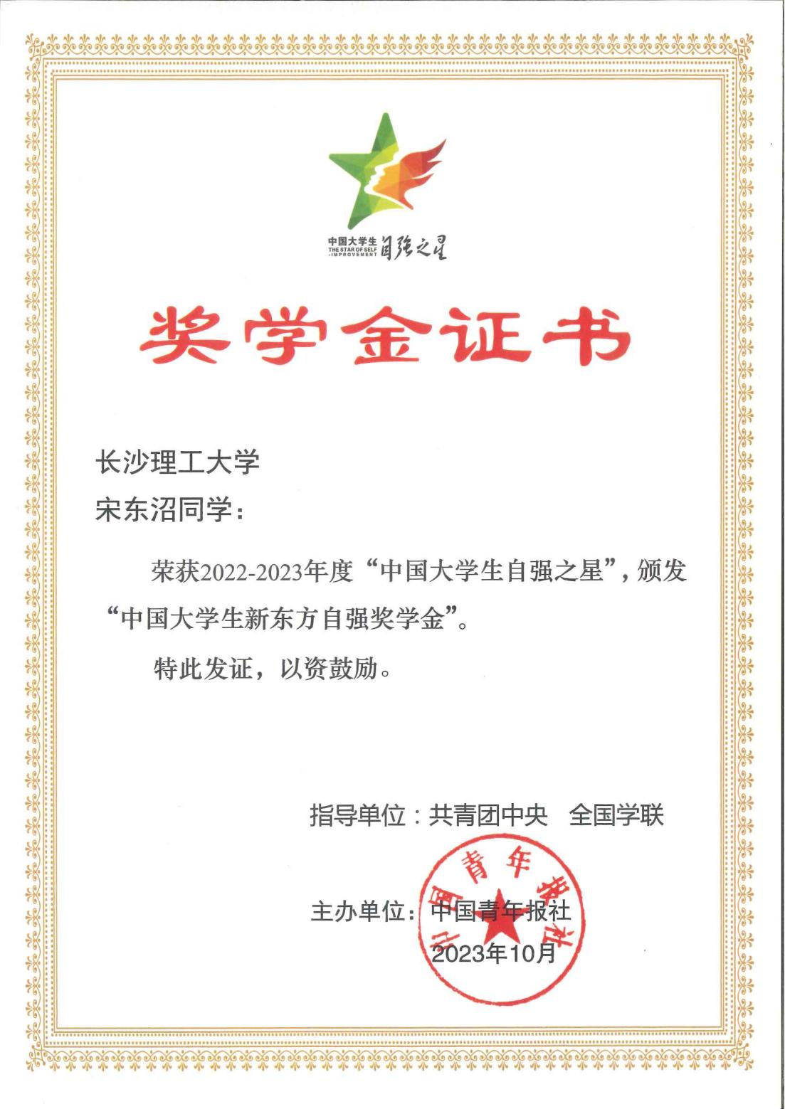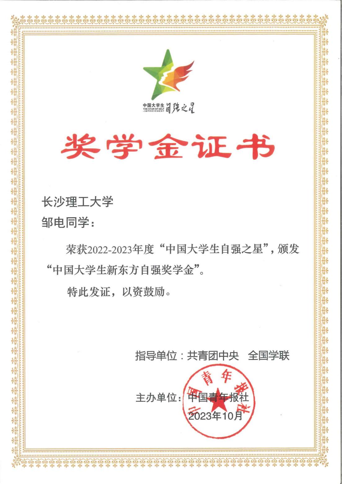 2022年8月20日,由共青团中央、全国学联指导,中国青年报社、新东方教育科技集团、中国青年创业就业基金会联合开展的2022年度“中国大学生自强之星”奖学金推报活动结果揭晓,william汽机学院2020级本科生宋东沼同学和计通学院2020级研究生邹电同学从众多学子中脱颖而出,荣获2022年度“中国大学生自强之星”。