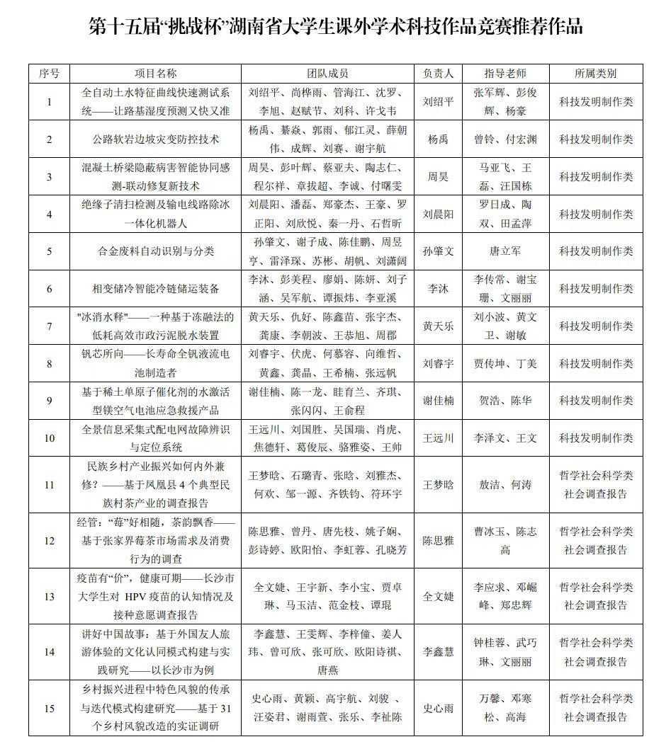 经专家评审,拟推荐15项作品参加第十五届“挑战杯”湖南省大学生课外学术科技作品竞赛。