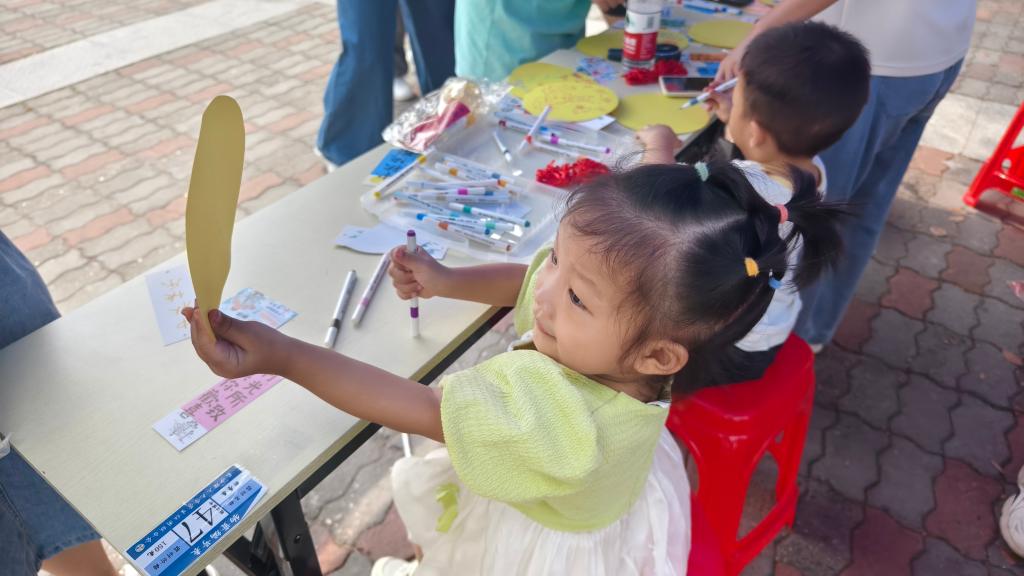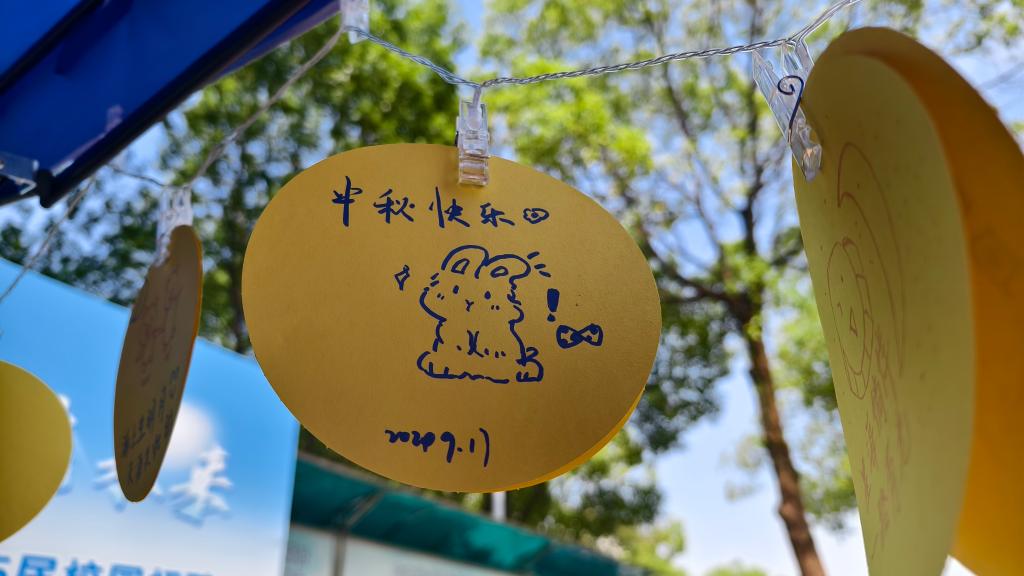 参与者们还纷纷在月亮与月饼形状的创意卡片上挥洒创意,有的勾勒出皎洁明月下的团圆景象,有的则描绘出形态各异的月饼,更有甚者巧妙地将中秋传统故事与现代元素融合,创作出了一幅幅既传统又富有新意的可爱或有趣的艺术作品。这些色彩斑斓、充满想象力的作品,展现了同学们丰富的内心世界和无限的创造力,成为了活动最为火热的环节,生动有趣而富有节日意义。一张张满载祝福与创意的卡片被精心布置在棚边四周。同学们对自己的作品拍照打卡留念,记录下这难忘的一刻。而抽奖中获奖的同学们也惊喜地收获了他们的中秋小礼品。