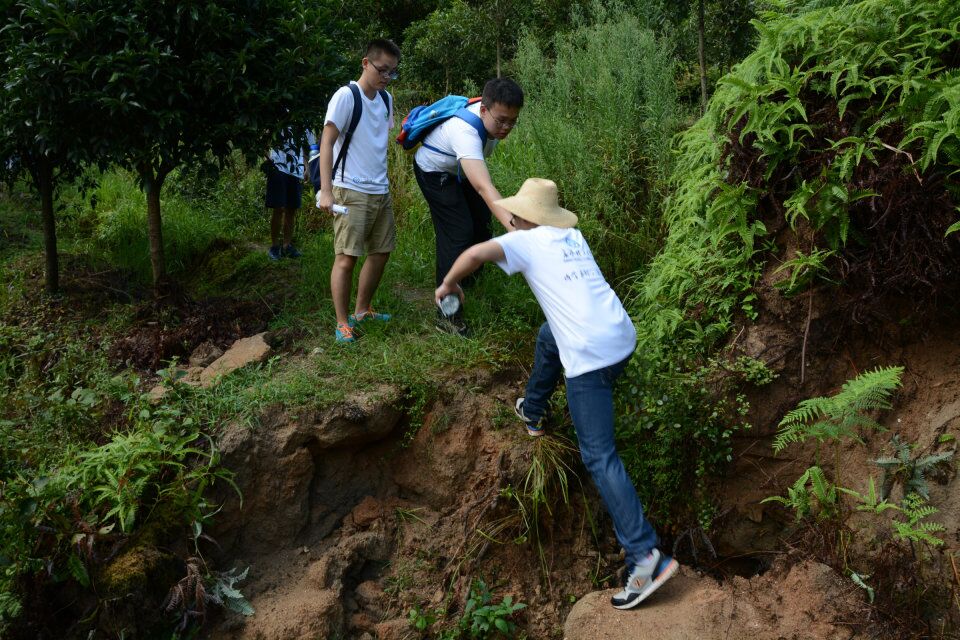 山路走到了尽头,车再也不能前进。沿着其他公路过去,一样可以把线路拉过去。但是在对比方案后,王主任和电力局几个师傅想从山路中再开辟一条新的路线,这样就可以大大缩短距离,减少施工资金和提高供电质量。没有路,就要自己开辟道路。由于刚下过雨,路面湿滑,加之山间根本就没有路,全靠慢慢的摸索前进。陡坡早已不算什么,好几次,两拳宽的小路,左边是悬崖,右边是水坑。大家相互提醒,互相帮助,一同前行。40多分钟的山路,最后终于到达了线路的终点。完成了此次测量任务。