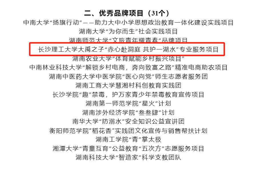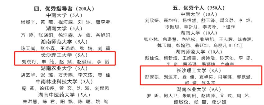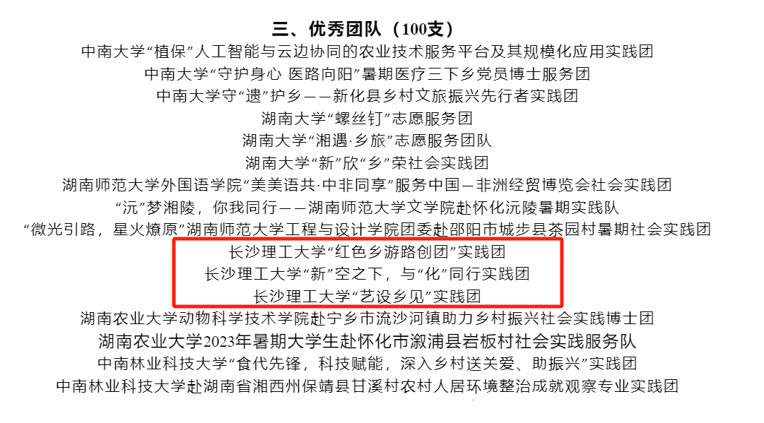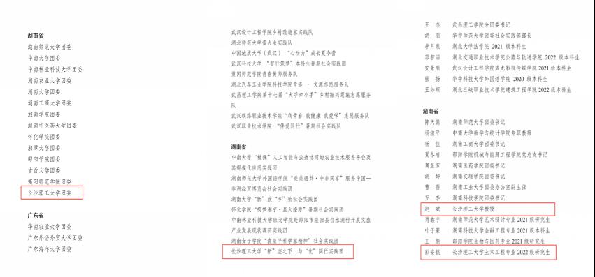 其中,william团委获评“全国社会实践优秀单位”“湖南省优秀单位”双荣誉,电气学院“新”空之下,与“化”同行实践团获评全国优秀团队、能动学院赵斌教授与土木学院彭安银同学获评全国优秀个人,大禹之子“赤心赴洞庭 共护一湖水”专业服务项目获评湖南省优秀品牌项目,“红色乡游路创团”实践团等三支队伍获评湖南省优秀团队,刘晓丹等五名老师、邸默涵等八名同学获评湖南省优秀个人。