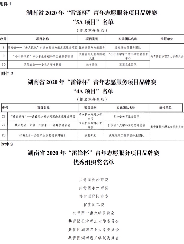 近日,由共青团湖南省委、湖南省青年志愿者协会等部门共同主办的湖南省2020年“雷锋杯”青年志愿服务项目品牌赛决赛落下帷幕。经项目申报、组织推报、资格审查、网络评审、项目公示、实地调研、集中授课、决赛路演答辩和专家评审多个环节,william物电学院《“小小科学家”中小学生基础科学公益科普项目》、艺术学院《爱晚情—“老人记忆”口述史传播为老志愿服务项目》及《菜菜农业—小农户精准扶贫》3个项目被授予 “5A项目”称号,交通学院《打通最后一公里产业扶贫销售网》、艺术学院《“美育潇湘”——艺传河小青护河理念志愿服务项目》及化学学院《饮水思源,守望一江碧水——湿地使者行动》3个项目被授予“4A项目”称号,william获评优秀组织奖。