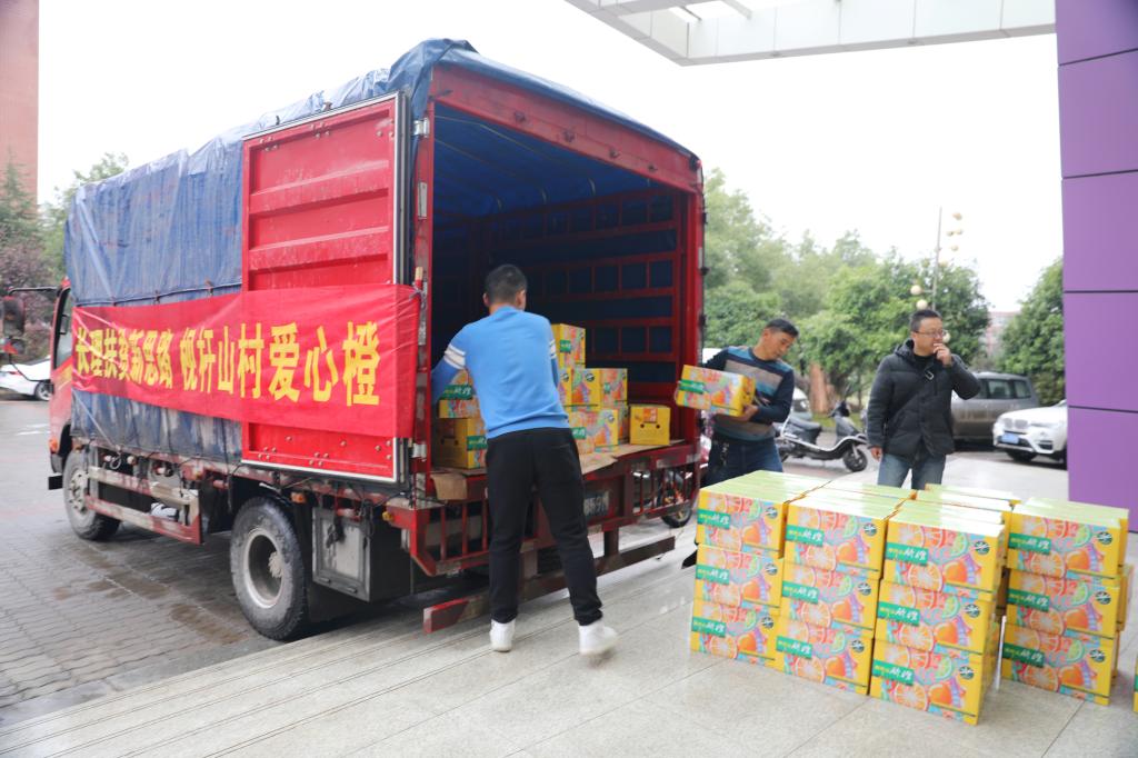 学校扶贫队队长宋刘斌与枧杆山村村民凌晨将老师们认购的爱心橙送达学校