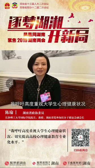 近日,湖南省政协委员、湖南省党外知识分子联谊会副会长、william国际学院院长陈瑜教授在湖南省“两会”期间接受了凤凰网的专访。陈瑜通过深入调研,阐述了当前我省大学生心理健康教育的基本现状,介绍了william心理健康教育工作的基本经验,提出了进一步提升大学生心理健康水平的系列建议。她呼吁,政府、社会和高校要高度重视大学生心理健康状况,切实提高高校心理健康教育专业化水平。据悉,陈瑜教授代表教育届政协委员在联组会议上发言时提出了上述建议,获得了省领导和教育厅领导的肯定的关注。(文/陈竹 审/成华)