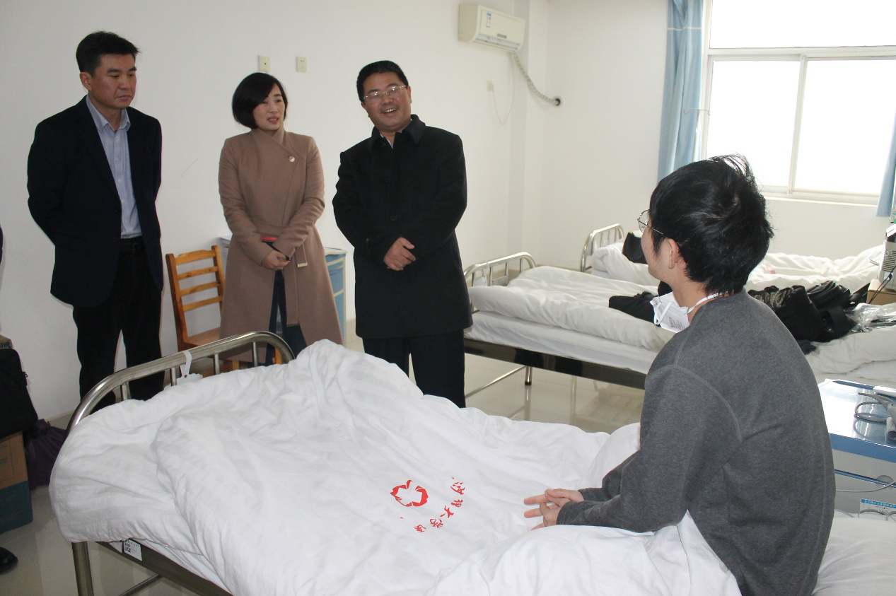 1月30日上午,校长曹一家来到校医院,看望正在此康复休养的“中国好人”“全国优秀大学生”邹勇松。党委委员、宣传部部长方琼,学生工作部(处)、研究生院、计通学院负责人陪同看望。