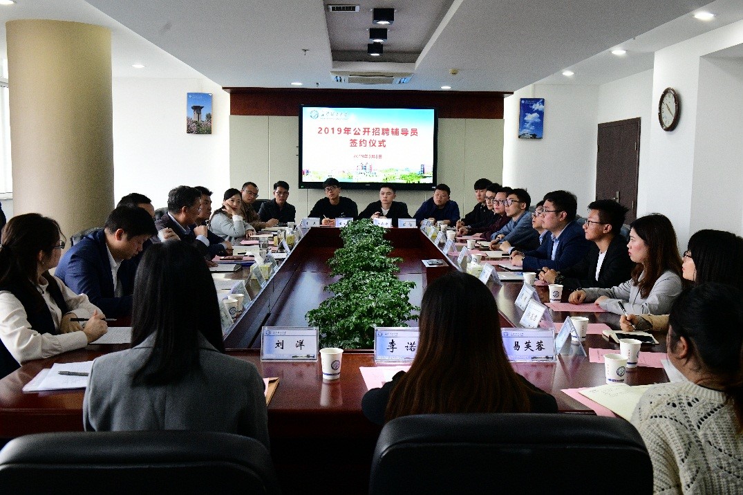 学校2019年新聘辅导员签约仪式于5月8日上午在云塘校区一办五楼会议室举行。副校长谈传生,组织部、学工部(处)、团委、人事处、招就处、研工部、心理中心等部门负责人及全体新聘辅导员参加。