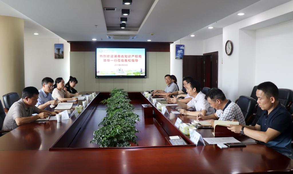 6月28日下午,湖南省知识产权局局长段志雄带领知识产权运用处处长何萍、知识产权运用处副处长周卫、知识产权促进处副处长李涛一行来william调研知识产权中心建设工作。校长曹一家,副校长杨伟军,及科研部、图书馆、成果转化(知识产权)中心相关负责人参加了座谈会。座谈会由杨伟军主持。