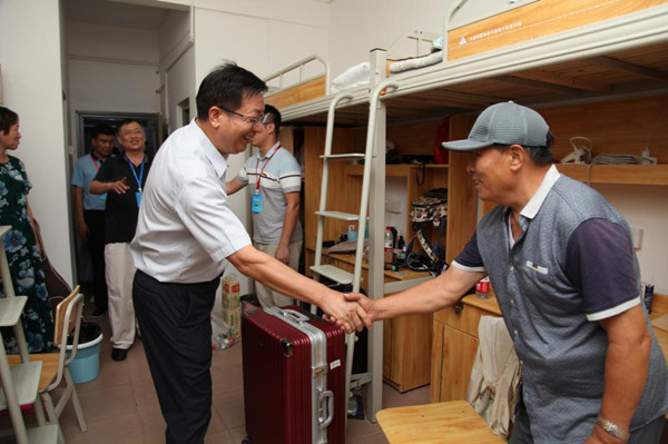 付宏渊一行先后来到了西苑11栋、西苑2栋学生公寓,了解迎新保障工作及新生报到入住情况。在新生宿舍,校领导一行遇到了正在整理床铺的交通学院道桥1906班王夏同学一家。“空调开了吗?”“还有什么需要帮助的地方?”付宏渊仔细查看了宿舍空调、照明等设施情况,关切询问了王夏同学入学后的感受,并与新生家长亲切交流。“孩子交给你们我放心。”王夏同学的家长动情地说。