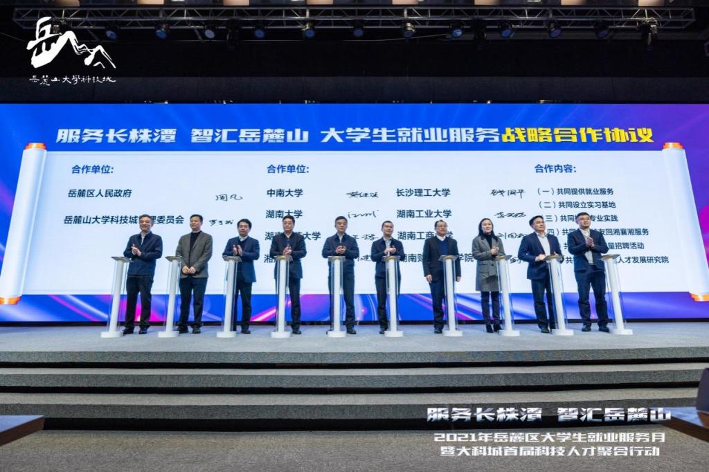 3月20日,“服务长株潭 智汇岳麓山”2021年岳麓区大学生就业服务月暨大科城首届科技人才聚合行动系列活动启动,副校长钱国平带领招就处相关负责人参加,并与岳麓区大学科技城签订大学生就业服务战略合作协议。