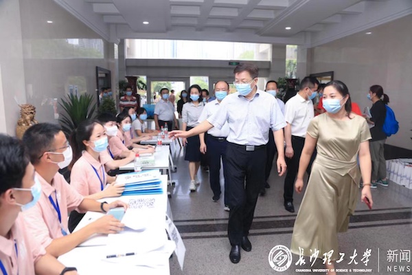 在金盆岭校区,付宏渊一行走访了各迎新报到点和学生宿舍,仔细询问新生报到和入住情况,实地检查宿舍提质改造进展,看望慰问迎新工作人员和学生志愿者并亲切叮嘱正确佩戴口罩,做好个人防护,为新生报到提供优质周到的服务。
