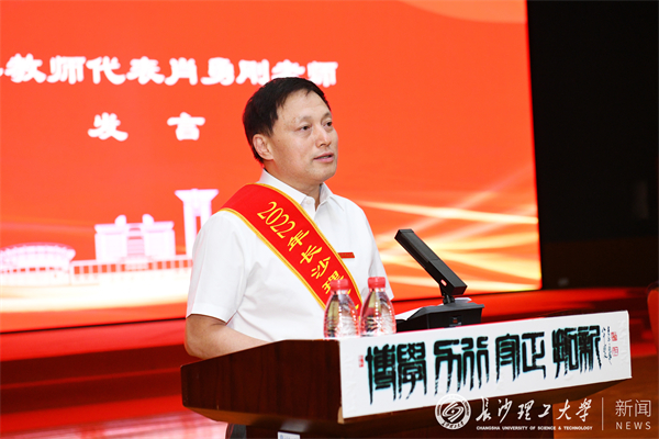 教师代表、土木学院肖勇刚老师发言,他回顾了自己39年来的教师生涯,表示作为一名教师,必须做到政治坚定、无私奉献,严谨治学、教风端正,善待学生、诚信育人,团结同事、关爱青年教师,与时俱进、不断更新教学理念,潜心钻研、以科研促教学,践行对人民教育事业的忠诚与热爱。他庄重承诺,将“思行如一守初心,永做教育追梦人”,在余下的教师职业生涯中继续努力,为学校发展贡献力量。