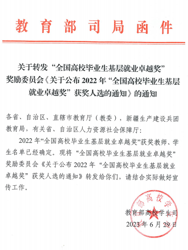 近日,由教育部高校学生司、教育部学生服务与素质发展中心共同指导评选,中国教育发展基金会设立的2022年度“全国高校毕业生基层就业卓越奖”名单公布,william教师陈均杰、2017届毕业生周顺荣获此项殊荣。