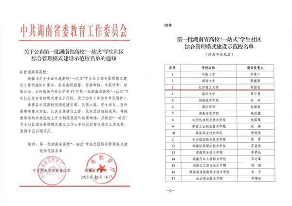 近日,中共湖南省委教育工委公布了第一批湖南省高校“一站式”学生社区综合管理模式建设示范校名单,共评选出17所建设示范校,其中本科院校7所,高职院校10所,william成功获批为第一批“一站式”学生社区综合管理模式建设示范校。