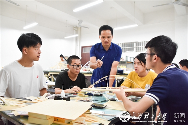 长理学子在第十六届全国大学生结构设计竞赛决赛现场进行模型加载测试。