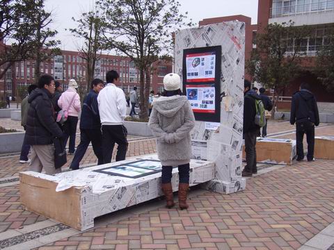 本次工业设计展共展出37件作品,是我院学生参加湖南省首届国际“芙蓉杯”的参赛作品。这些作品充分体现了主题“灾难”与“关爱”,紧贴生活实际,在设计理念中增添了许多人性化成分,处处体现着“关爱”的主题,如安全性强且使用便利的灭火弹、服务周到的送餐机器人等。同学们还别出心裁,在地面上贴上了指示汶川、北川等地震重灾区地理方位的箭头表识,并将展示台部分放倒在地上或摆出相互倚靠的造型,以这种方式突出“灾难”的主题。尽管当日天气寒冷,同学们用心制作的工业设计作品和精心摆放的展示台还是吸引了许多同学在广场上留连不去。在年末之际,其“灾难与关爱”的主题再次唤起了人们对大灾难的回忆,令人感触颇多。我们相信有了这样一个展示的平台,理工学子们也将会有更多的发展空间,我们的课余文化生活也将更加的丰富多彩。